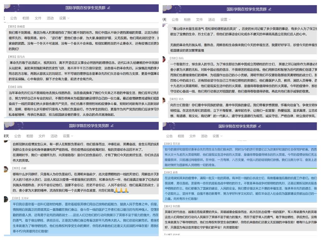 活动伊始,学生党员代表喻成辉带领全体党员重温了入党誓词。随后,各支部党员分别做了交流发言并撰写心得体会。校学生会主席、第二学生支部党员颜健斌谈到:当年无数无产阶级革命家用身躯铸就了血肉长城,如今无数白衣战士主动到抗疫一线甚至付出了生命的代价,作为当代大学生,在学习生活中,都应严格要求自己,发扬大无畏的抗疫精神;校学生团工委副书记、第一学生支部党员曾心志表示:我们要致敬所有坚守在自己工作岗位的战士们,西昌森林火灾十九名消防救援人员殉职,他们是真正的烈火英雄,我们是时代的幸运儿,更应肩负起时代赋予我们的责任和使命;院学生会主席、第二学生支部党员任子健谈到:作为一名青年党员我们应时刻不忘初心使命、学好专业知识、时刻听党指挥、带头服从安排。最后,所有党员登录“中华英烈网”,进行网上献花点烛,写下悼念寄语,寄托追思之情。