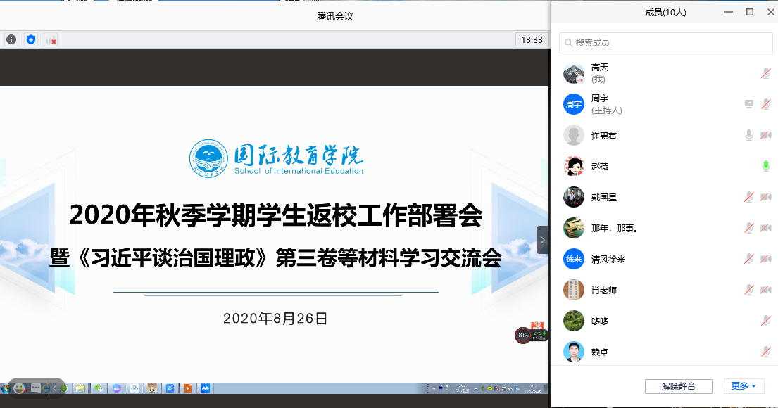 8月26日下午,国际教育学院在腾讯会议平台召开会议,部署2020年秋季学期学生返校工作,学习讨论《习近平谈治国理政》第三卷等材料。会议由学院党委副书记赵薇主持,学院全体辅导员、班主任参会。