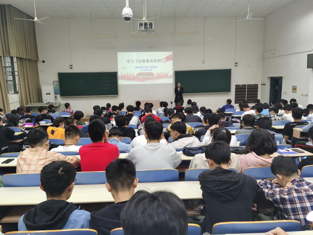 为了让同学们了解宗教、学习《宗教事务条例》,从而崇尚科学,远离邪教。9月20日下午,国际教育学院在教学北楼C102教室举行了题为“学习《宗教事务条例》”的专题讲座,全院220余名新生聆听了讲座,讲座由学生工作办公室戴国星老师主讲。