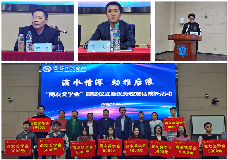 11月5日下午,滴水情深 助推后浪——“商友奖学金”颁奖仪式暨优秀校友话成长活动分别在北C105和北A210举行。江西商友实业有限公司董事长陈健、校学生工作处处长高明、国际教育学院党委书记陈春柏和机械与电气工程学院、经济贸易学院党、国际教育学院党委副书记出席了此次仪式,参加此次活动的还有学生资助管理中心和各学院负责资助工作的老师、2020年 “商友奖学金”获得者以及来自相关学院的190余名同学,活动由校资助中心主任高丽明主持。