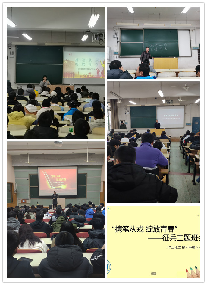 各班班主任深入分析了当前我国的国际国内形势及我国国防现代化建设现状,阐明了大学生应征入伍的重大意义,并围绕大学生青年的入伍条件、可享受的优惠政策、征集流程、国家资助办法、保留入学资格及退役后入学流程、大学生参军入伍发展平台等相关问题进行了详细讲解,并解读了参军入伍的“政治账、经济账、成长账”。希望同学们能够树立正确的征兵观念,优秀大学生应积极应征入伍,扬我大学生优秀面貌。