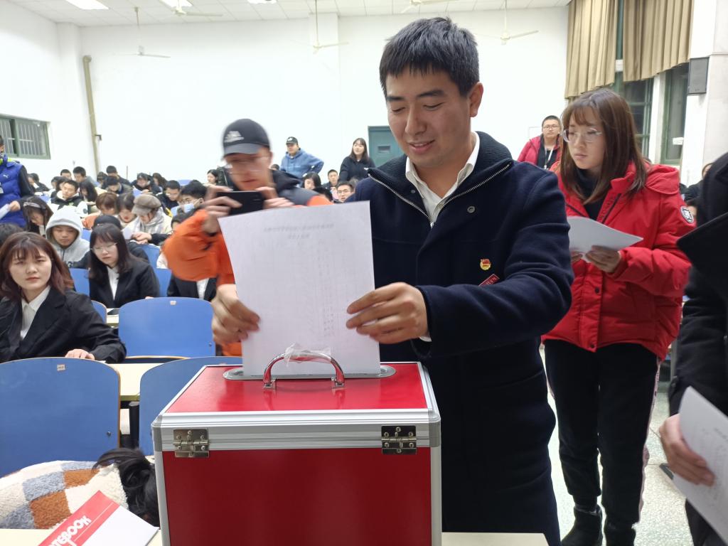 13日正值公家公祭日,会议正式开始前,全体成员为死难者同胞集体默哀,默哀结束后,大会在庄严的国歌声中开幕。在确定资格审查小组名单,计票、监票小组名单、代表资格,通过了审查报告后,工作人员通过PPT展示了各委员候选人简介,开始选举第八届团委委员和第八届学生委员会委员。随后,上届学生副书记刘欣悦、学生会主席任子健分别受委托作了工作报告,回顾了工作成果和指出了工作中的不足。此外,徐子尧代表团委组织部作了团费收缴及使用情况说明报告,随着阵阵掌声,所作的报告得到认可,均予以通过。最后,经过最终计票结果,选举出赖卓等9位第八届团委会委员和陶钧等11位第八届学生委员会委员。大会在全体成员慷慨激昂唱响共青团团歌中圆满结束。