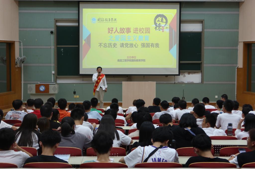 为做好学生思想教育工作,常态化开展党史学习教育。在“九一八”到来之际,国际教育学院特邀中国好人、南昌市道德模范范圣高在北C104作“不忘历史、请党放心、强国有我”爱国主义专题报告,2021级全体新生参加报告会。