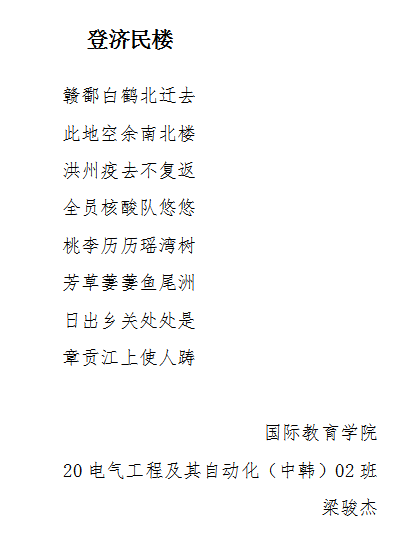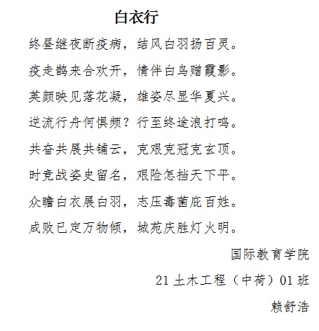 为配合抗击新型冠状病毒肺炎工作,展现前线“抗疫”工作人员风貌和精神,国际教育学院在学风建设月期间在全院开展了“‘疫’词,‘疫’句”原创诗词活动。