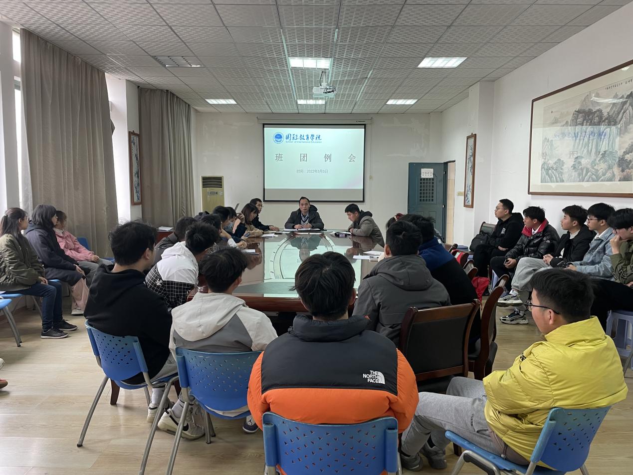 为做好新学期学生管理工作,更好地了解学生的思想动态,2023年3月3日国际教育学院在北A210召开新学期第一次班团例会,学院党委副书记戴国星和全体辅导员参加会议,全院各班班长和团支书出席会议,会议由学院学工办副主任兼团委副书记赖卓主持。