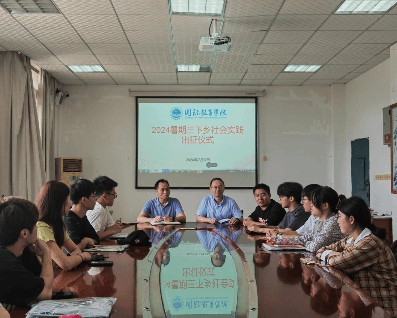 为深入学习贯彻习近平新时代中国特色社会主义思想,引导和帮助广大青年学生在与现实相结合的“大思政课”中“受教育、长才干、作贡献”,引领学生立志做有理想、敢担当、能吃苦、肯奋斗的新时代好青年,7月3日,国际教育学院党委书记章蔚中,党委副书记戴国星和全体队员在教学北大楼A210举办本次暑期“三下乡”社会实践出征仪式。