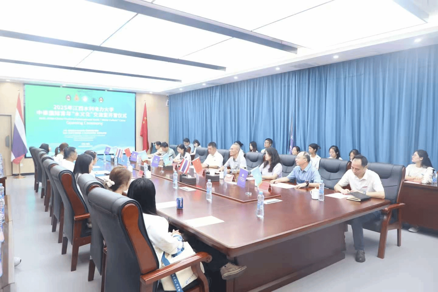 为庆祝中泰建交五十周年暨“中泰友谊金色五十年”,2025年10月13日,由国际交流与合作处(国际教育学院)主办,人文与艺术学院、水利工程学院和体育教学部协办的中国-泰国国际青年“水文化”交流营开营仪式在瑶湖会议中心举行,泰国皇家理工大学、泰国东方大学、泰国素叻他尼皇家大学、泰国清莱皇家大学代表团成员及我校师生代表共计40余人参加此次交流营。
