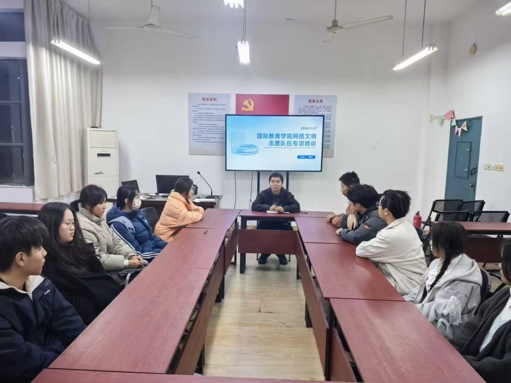 为营造清朗校园网络空间,提升学生网络素养,国际教育学院于11月27日在北A201教室举办网络文明志愿队伍专项培训。本次培训由学院团委书记赖卓担任主讲,学院辅导员和网络文明志愿者参加此次活动。