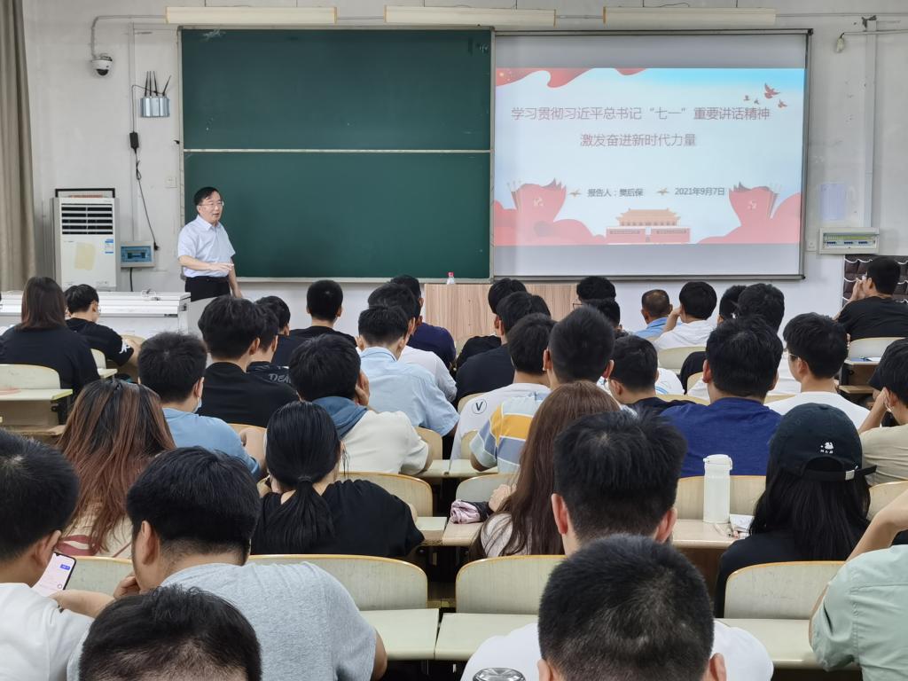 根据学校学习贯彻习近平总书记在庆祝中国共产党成立100周年大会上重要讲话精神宣讲工作方案要求,9月7日下午,副校长樊后保在教学北楼B区213给联系班级宣讲习近平总书记“七一”重要讲话精神,宣讲由国际教育学院党委书记陈春柏主持,国际教育学院党员教师、联系班级2018级电气工程及其自动化1、2班共计100余人聆听了宣讲。