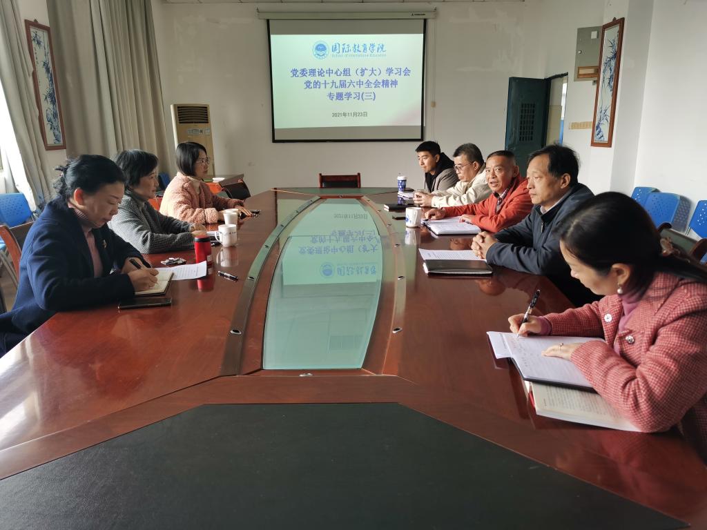 11月23日下午,国际教育学院党委理论学习中心组(扩大)学习会根据学习安排,在北A210会议室组织了党的十九届六中全会精神专题学习,全体党委委员和支部书记参加了学习会,经济贸易学院党委书记王键、党政办公室主任谢淑玉列席旁听。