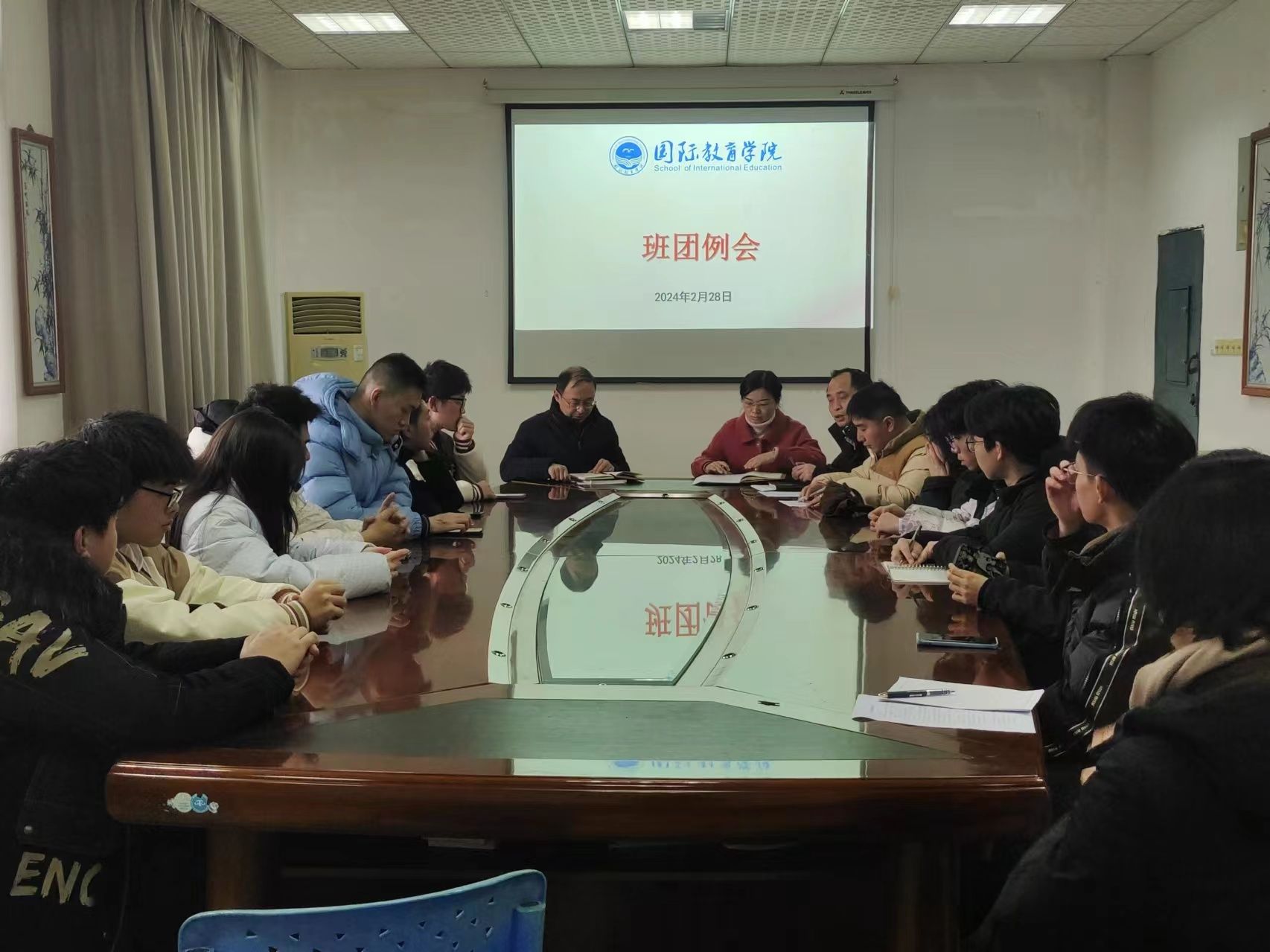 2月28日下午,国际教育学院在北A210召开2024年度第一次班团例会,学院党政领导班子所有成员、全体辅导员班主任参加本次会议。