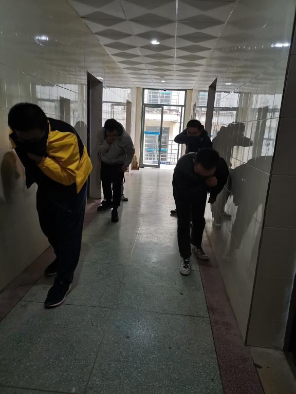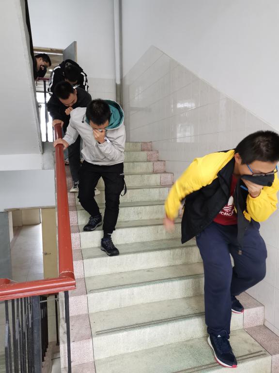 在老师简单介绍逃生要点后,同学们开展了演练。演练设置的场景是火灾警报响起,同学们有序安全的应急逃生。参加演练的同学打湿毛巾、衣物,捂住口鼻,有序弯腰低头沿墙体、扶手撤离。演练过程快速、高效,在短短时间内,参加演练同学都实现了安全撤离。