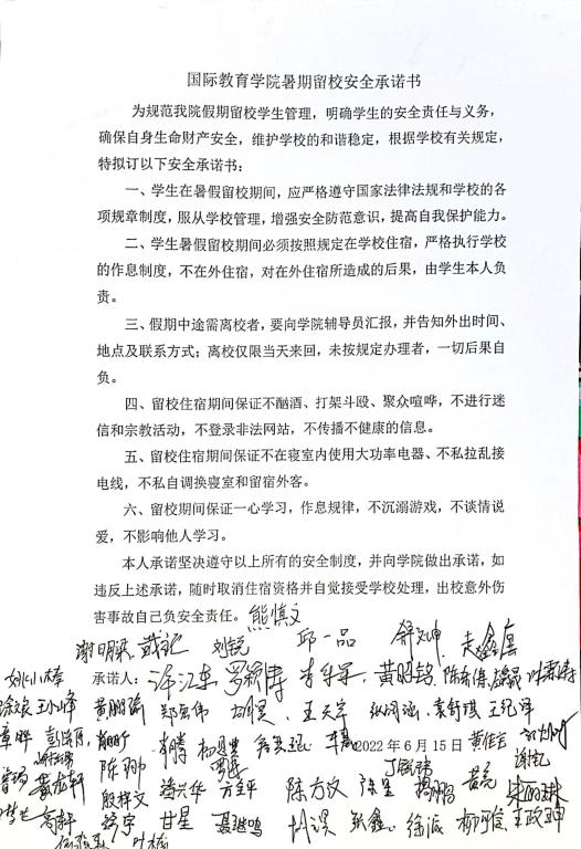 学院在疫情期间多次召开“三包五保”工作会议,副校长樊后保、学院党政领导班子深入学生宿舍,了解学生思想动态,聆听学生诉求。针对学生暑期留校学习,学院召开暑期留校学生安全教育大会,对学生留校期间管理提出进一步要求,严格请假制度,严禁打架、酗酒、使用违规电器等,并签署暑期留校安全承诺书,确保学生在留校期间的人身、财产安全,切实提高学生自我保护的安全防范意识。